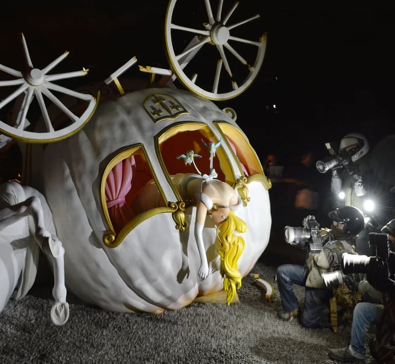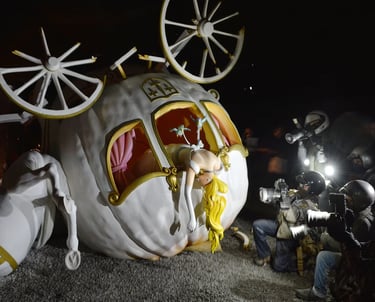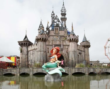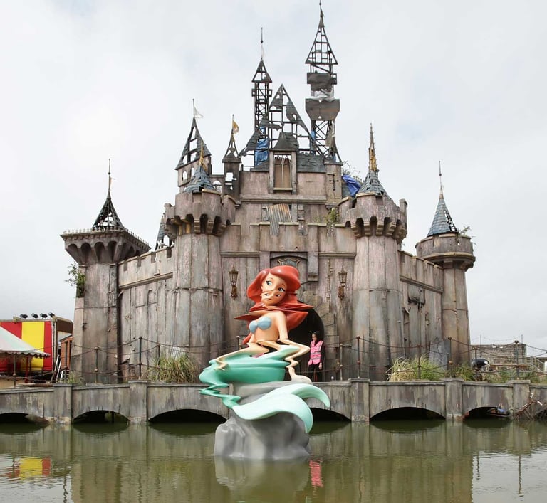 The creation of a Disney-themed Dismaland park, where everything is the opposite of what you'd expect in a kids' park. A pond with remote-controlled toy boats carrying migrants (a powerful sociological reflection); a fake half-built Disney castle facing a glitched Little Mermaid; a room full of photographer flashes with Cinderella's overturned carriage (a reference to Lady Diana's accident); a bumper car track with just one car carrying Death; fake burned-out info vans; park staff in Mickey Mouse ears handing out black balloons that say “I’m an imbecile,” and much more.