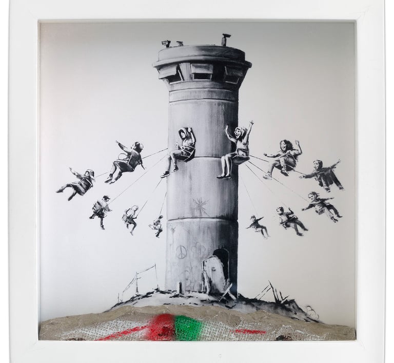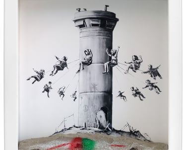 The Walled Off Hotel on the Gaza Strip in Palestine, entirely set up and painted by the artist and local artists, fully themed and politicized. It sparked an absurd tourist influx in one of the world's most dangerous zones, where you might get bombed, kidnapped, or shot at any moment.